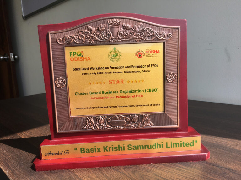 BASIX Krishi Samruddhi Limited (BKSL) was awarded as top performing CBBO in Odisha in implementation of the Central Sector Scheme to promote 10,000 FPOs in India