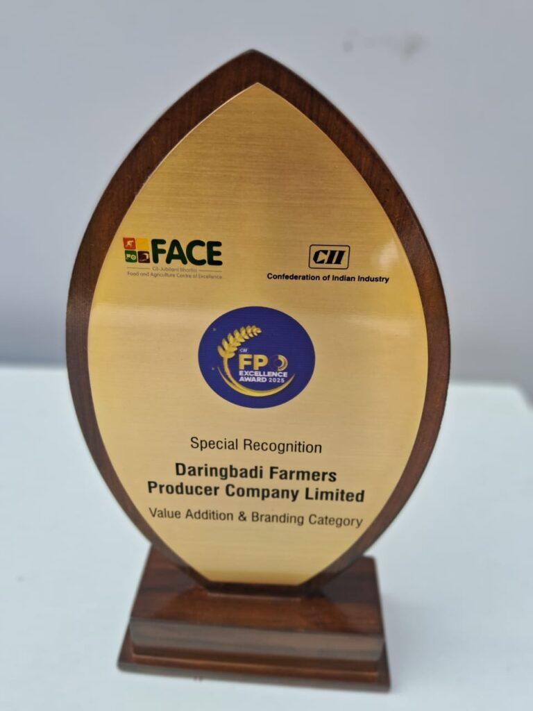 Daringbadi Farmer Producer Organisation, Kandhamal, Odisha, was honoured by the Confederation of Indian Industry (CII) on 12 December 2025 at New Delhi for its excellence in value addition and branding initiatives aimed at strengthening rural enterprises. The award recognises the FPO’s efforts in developing market-oriented products, improving branding strategies, and enhancing the economic viability of farmer-led enterprises.