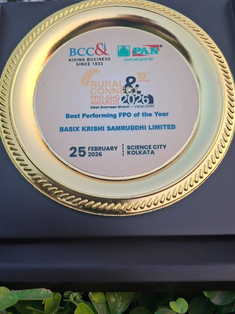 Basix Krishi Samruddhi Limited is honoured with the “Best Performing FPO Enabler of the Year” award for its outstanding contribution to the FPO ecosystem. The recognition is conferred by the Bengal Chamber of Commerce & Industry (BCC&I) at Science City, Kolkata on 25th February 2026, during the “Rural Connect FPO-SHG Awards 2026” held under the Viksit Grameen Bharat – Vision 2030 initiative. The award acknowledges Basix Krishi’s consistent efforts in strengthening Farmer Producer Organizations, enhancing agri-value chains and promoting sustainable livelihood opportunities for rural communities.
