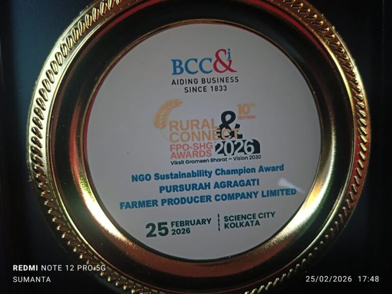 Pursurah Agargati FPO from Hooghly, West Bengal (under 10K FPO, IA-SFAC) is honoured by the Bengal Chamber of Commerce & Industry (BCC&I) under the “NGO Sustainability Champion” category. The award was presented on 25th February 2026 at Kolkata during the “Rural Connect FPO-SHG Awards 2026” held under the Viksit Grameen Bharat – Vision 2030 initiative.