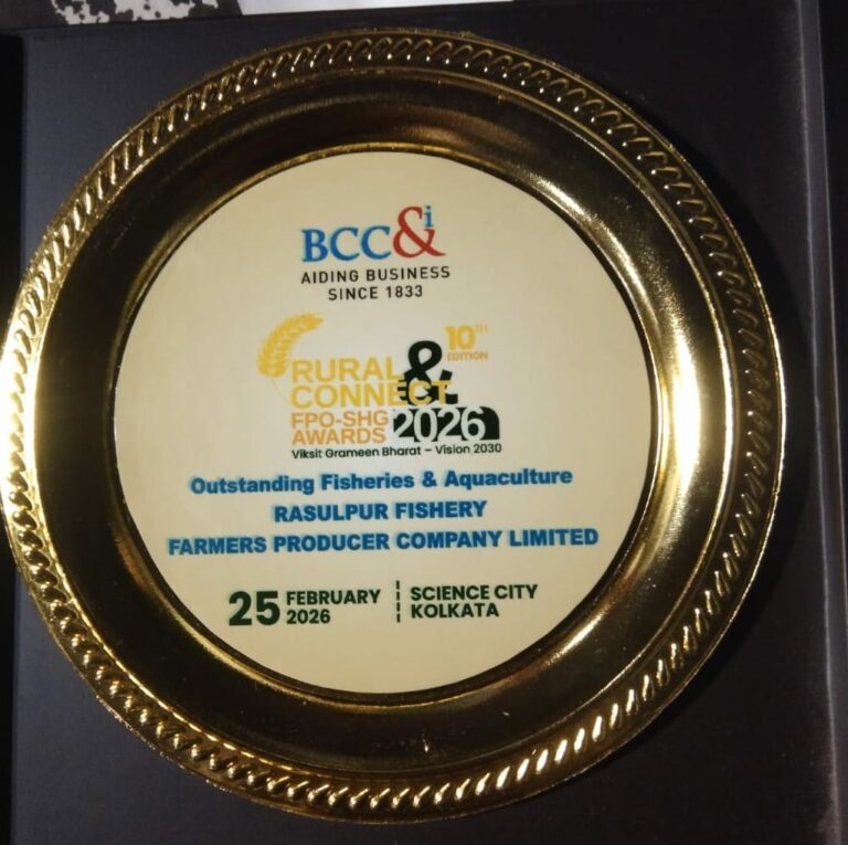 Rasulpur Fishery FPO from Jajpur district, Odisha (under PMMSY FPO, IA-NFDB) is conferred as “Outstanding Fisheries & Aquaculture” FPO by the Bengal Chamber of Commerce & Industry (BCC&I). The award was presented at Science City, Kolkata on 25th February 2026 during the “Rural Connect FPO-SHG Awards 2026”, as part of the Viksit Grameen Bharat – Vision 2030 event.
