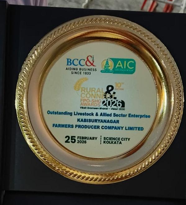 Kabisuryanagar FPO from Ganjam, Odisha (under 10K FPO, IA-SFAC) received the “Outstanding Livestock & Allied Sector Enterprise” award from the Bengal Chamber of Commerce & Industry (BCC&I). The honour was conferred at Science City, Kolkata on 25th February 2026 during the “Rural Connect FPO-SHG Awards 2026” held under the Viksit Grameen Bharat – Vision 2030 initiative.
