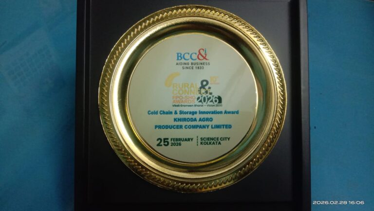 Khiroda Agro FPO, Hooghly district, West Bengal (under 10K FPO, IA-SFAC) is honoured for its effective management of a storehouse under the “Cold Storage & Innovation” category by the Bengal Chamber of Commerce & Industry (BCC&I). The recognition was conferred at Science City, Kolkata on 25th February 2026 during the “Rural Connect FPO-SHG Awards 2026” held under the Viksit Grameen Bharat – Vision 2030 initiative.